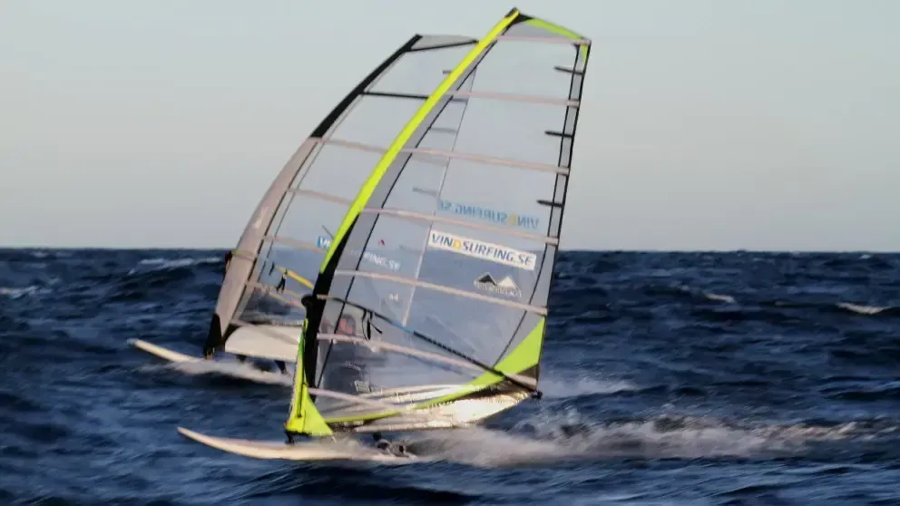 Tarek sailing a Dynamic Windsurfing board to Renees brygga